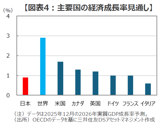 ■国際通貨基金(IMF)は原油価格の10%の上昇により世界経済の成長率が0.1~0.2%ポイントの下押し要因となると試算しています。仮に、原油価格が90ドル水準で今後1年間にわたり推移した場合、経済協力開発機構(OECD)が予想する2026年の日本の経済成長率である+0.9%(2025年12月時点)はゼロ近辺まで下振れることとなりかねない点についても注意が必要でしょう(図表4)。