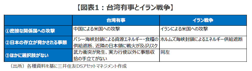■さらに、イランは現在、日本の同盟国である米国と交戦状態にあるため、「集団的自衛権」の3要件である、①密接な関係国(米国)への武力行使、②日本の国家としての存立が脅かされる事態、③ほかに適当な選択肢がない事態、に該当する可能性があり、安保法制が規定する「集団的自衛権」の行使が可能となる「存立危機事態」に該当する蓋然性が高まります(図表1)。