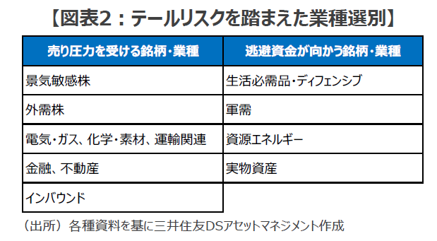 こうした「テールリスク」が現実化すると、相場の初動としては日本の「トリプル安」が想定されます。また、その後の業種選別としては、①景気敏感株、②外需株、③「電気・ガス」「化学・素材」「運輸関連」、④「金融」「不動産」、⑤インバウンド関連株、が売り圧力にさらされる一方、ディフェンシブ株、軍需関連、資源エネルギー関連、実物資産には逃避資金が向かう展開が想定されます。また、ポートフォリオ戦略としては、①グローバル資産へのシフト、②インフレのヘッジ、③ボラティリティのヘッジ、が有効なアプローチとなりそうです。