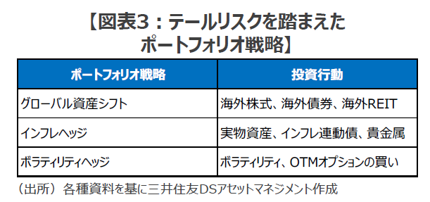 ■また、ポートフォリオ戦略としては、リスク資産を中心に日本の「トリプル安」が想定される投資環境では、①円資産からグローバル資産へのシフト(海外株式、海外債券、海外REIT)、②インフレヘッジのための実物資産、インフレ連動債、金などドル建ての貴金属、そして、③ボラティリティ上昇やテールリスクの顕在化の恩恵を受ける「VIXなどのボラティリティ指数の買い」や「アウトオブザマネー(時価から大きく外れた生起確率の低い価格)のオプションの買い」などが有効なアプローチとなりそうです(図表3)。