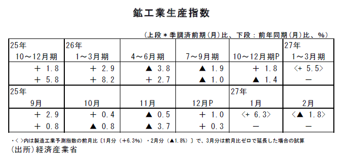 ●経済産業省の基調判断の推移を少し長いスパンでみてみよう。13年9月分で「総じてみれば、生産は持ち直しの動きがみられる」と6カ月ぶりの上方修正となった。ここでようやく「緩やかな」がとれた。10月分では「総じてみれば、生産は持ち直しの動きで推移している」と言葉は若干変わったが基調判断据え置きとなった。その後13年11月分・12月分・14年1月分・2月分に続き、3月分も「総じてみれば、生産は持ち直しの動きで推移している」と据え置いていた。