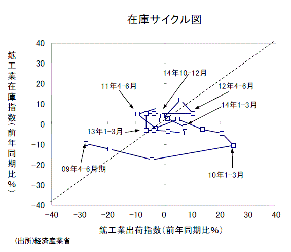 ●鉱工業全体での縦軸に在庫の前年比をとった在庫サイクル図をみると、13年10~12月期では、出荷の前年比が+6.4%、在庫が同▲4.3%、14年1~3月期でも、出荷の前年比が+7.4%、在庫が同▲1.4%、と45度線を下回っていた。しかし、14年4~6月期では、在庫が6四半期ぶりに前年同期比増加に転じ、出荷の前年比が+1.3%、在庫が同+2.8%、と45度線を上回ってしまった。14年7~9月期でも、出荷の前年比が▲0.5%、在庫が同+4.0%、と45度線を上回り、14年10~12月期でも、出荷の前年比が▲1.5%、在庫が同+6.1%、と45度線を上回っている。在庫サイクル図からは、依然、在庫積み上がり局面にあると言える。