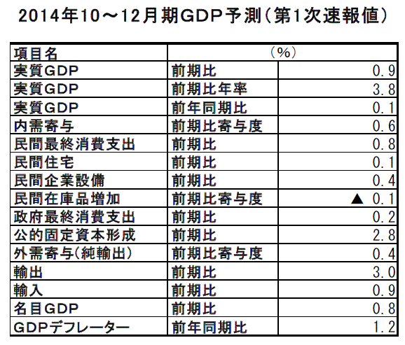 ●2月16日に発表される10~12月期第1次速報値では、実質GDP成長率は前期比+0.9%程度、前期比年率+3.8%程度と3四半期ぶりのプラス成長を予測する。消費税率引き上げの影響や天候不順などで落ち込んだ4~6月期、7~9月期の減少局面を抜け出したかたちになろう。