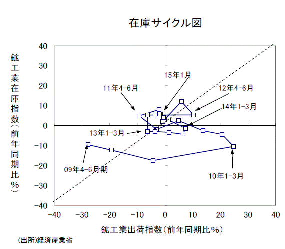 ●鉱工業全体での縦軸に在庫の前年比をとった在庫サイクル図をみると、13年10~12月期では、出荷の前年比が+6.4%、在庫が同▲4.3%、14年1~3月期でも、出荷の前年比が+7.4%、在庫が同▲1.4%、と45度線を下回っていた。しかし、14年4~6月期では、在庫が6四半期ぶりに前年同期比増加に転じ、出荷の前年比が+1.3%、在庫が同+2.8%、と45度線を上回ってしまった。14年7~9月期でも、出荷の前年比が▲0.5%、在庫が同+4.0%、と45度線を上回り、14年10~12月期でも、出荷の前年比が▲1.5%、在庫が同+6.1%、と45度線を上回っている。15年1月分でも、出荷の前年比が▲1.9%、在庫が同+5.7%、と45度線を上回っている。在庫の前年比は足元も高めで推移している感じがある。在庫サイクル図からは、依然、在庫積み上がり局面にあると言える。