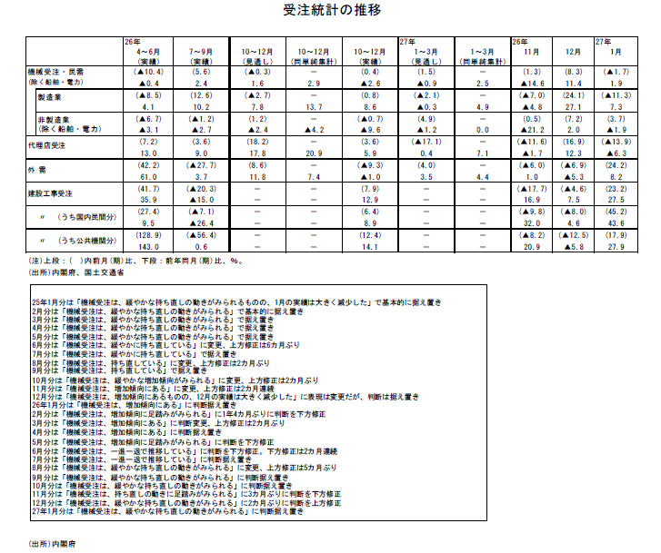 ●内閣府の基調判断は、14年7月分では「機械受注は、一進一退で推移している」であったが、8月分では「機械受注は、緩やかな持ち直しの動きがみられる」と5カ月ぶりの上方修正になり、9月分・10月分では据え置きとなった。11月分では「機械受注は、持ち直しの動きに足踏みがみられる」に3カ月ぶりに下方修正されたが、それも一時的で、前回12月分では「機械受注は、緩やかな持ち直しの動きがみられる」と、2カ月ぶりに上方修正され、8~10月分と同じ判断に戻った。今回1月分も「機械受注は、緩やかな持ち直しの動きがみられる」と判断据え置きになった。