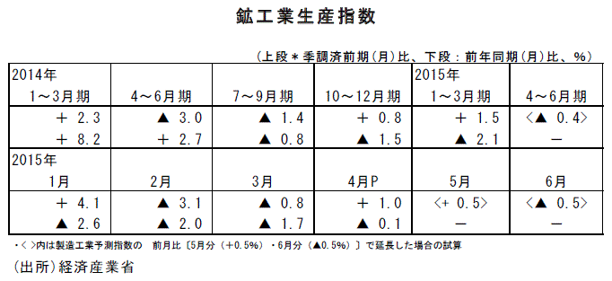 ●経済産業省の基調判断は14年3月分まで、「総じてみれば、生産は持ち直しの動きで推移している」とされていたが、消費税率引き上げがあった14年4月分で「総じてみれば、生産は横ばい傾向」と下方修正された。5月分でも同じ判断継続となった。6月分で12年8月分以来の表現である「総じてみれば、生産は弱含みで推移している」に下方修正され、7月分・8月分と判断継続となった。9月分で「総じてみれば、生産は一進一退にある」に上方修正され、10月分・11月分と据え置かれた。8月分を底に生産は増加傾向なので、12月分で判断は「総じてみれば、生産は緩やかな持ち直しの動きがみられる」に3カ月ぶりに上方修正された。15年1月分・2月分・3月分でも「総じてみれば、生産は緩やかな持ち直しの動きがみられる」で据え置きだった。今回4月分でも「総じてみれば、生産は緩やかな持ち直しの動きがみられる」で据え置かれた。