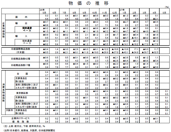 ●4月分の全国消費者物価指数・総合指数は2010年を100とした指数が、103.7となり、前月比は+0.4%上昇した。総合指数の前年同月比は+0.6%の上昇となった。消費税率引き上げの影響が大半なくなったので3月分の+2.3%から1.7ポイント鈍化したが、23カ月連続の前年同月比上昇となった。23カ月連続前年同月比がプラスなのは95年3月まで長期にわたって連続で上昇していた時以来で、20年ぶりのことだ。