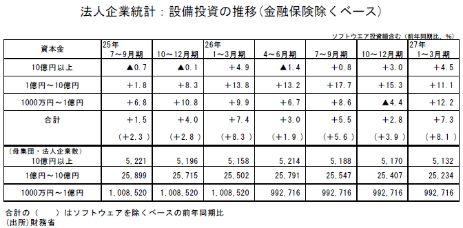 ●15年1~3月期の法人企業統計調査(速報値)の全産業(金融業・保険業を除くベース)の設備投資(ソフトウェア投資額を除くベース)の前年同期比は+8.1%と14年10~12月期の前年同期比+3.9%からは4.2ポイント改善し、8四半期連続の増加になった。また、ソフトウェア投資額を含むベースでは1~3月期の全産業の前年同期比は+7.3%だった。10~12月期の前年同期比+2.8%からは4.5ポイント改善した。資本金1000万円以上1億円未満の前年同期比は+12.2%で、10~12月期の前年同期比▲4.4%からは16.6ポイント改善した。資本金1億円以上10億円未満の前年同期比は+11.1%で、10~12月期の前年同期比+15.3%からは4.2ポイント鈍化した。資本金10億円以上の前年同期比は+4.5%と3四半期連続の増加で、10~12月期の前年同期比+3.0%からは1.5ポイントの改善となった。