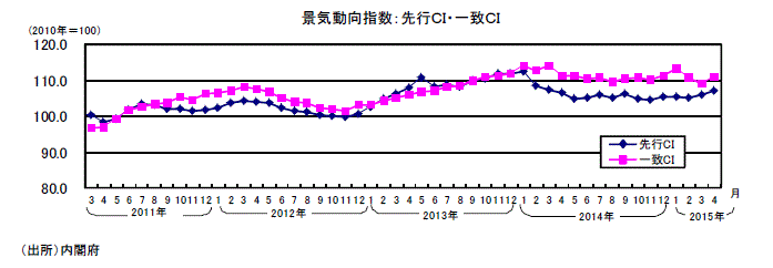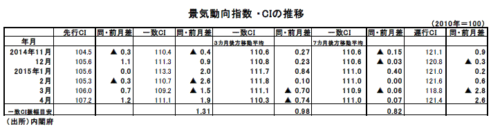 ●一致CIを使った景気の基調判断をみると、13年7月分で景気の基調判断が、「上方への局面変化」から景気拡張の可能性が高いことを示す「改善を示している」に上方修正された後、13年8月分~14年3月分では景気の基調判断は一番良い判断の「改善を示している」で据え置きだった。4月分で「足踏みを示している」に下方修正になり、5月分・6月分・7月分でも「足踏みを示している」に据え置きだった。しかし、8月分で「下方への局面変化」に下方修正され、9月分・10月分・11月分と同じ「下方への局面変化」で据え置きだった。12月分で、「改善を示している。ただし、基調判断に用いている3カ月後方移動平均のこのところの変化幅は、大きいものではない」に上方修正された。「改善を示している」に「下方への局面変化」から戻るのは異例のパスということだった。1月分で、但し書きは消えて、「改善を示している」という判断継続になった。2月分・3月分に続き今回4月分でも、「改善を示している」という判断継続になった。