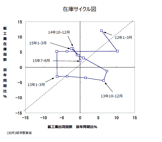 ●鉱工業全体での縦軸に在庫の前年比をとった在庫サイクル図をみると、14年1~3月期では、出荷の前年比が+7.4%、在庫が同▲1.2%、と45度線を下回っていた。しかし、14年4~6月期では、在庫が前年同期比増加に転じ、出荷の前年比が+0.9%、在庫が同+3.1%、と45度線を上回ってしまった。14年7~9月期で、出荷の前年比が▲0.8%、在庫が同+4.1%、と45度線を上回り、14年10~12月期で、出荷の前年比が▲1.9%、在庫が同+6.2%、15年1~3月期で、出荷の前年比が▲2.4%、在庫が同+6.2%、15年4~6月期で、出荷の前年比が▲0.3%、在庫が同+4.0%、と45度線を上回っている。15年7~8月分では、出荷の前年比が0.0%、在庫が同+2.2%とまだ45度線を上回っている。在庫サイクル図からは、依然、在庫積み上がり局面にあると言える。