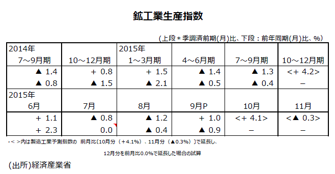 - 9月分鉱工業生産指数・前月比+1.0%で3カ月ぶりの増加 -