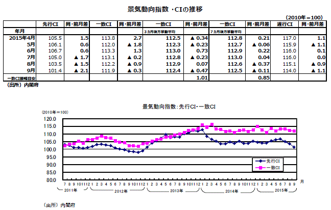 ●一致CIは前月差▲0.3と3カ月連続の下降になった。9月分の一致CIの指数水準は111.9である。東日本大震災発生時のボトムで直近のボトムである11年4月分の96.7よりは15.2ポイント高い水準だが、直近のピークである14年3月分の116.2よりは4.3ポイント低い水準だ。