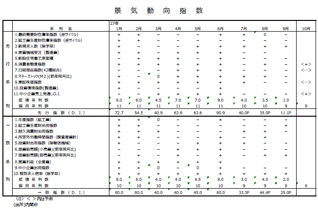 ●一致CIを使った景気の基調判断は、今回9月分では、景気拡張の動きが足踏み状態になっている可能性が高いことを示す「足踏みを示している」と、5カ月連続で同じ判断となった。
