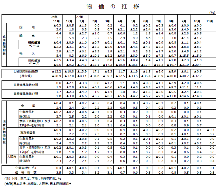 ●11月分の生鮮食品を除く総合の前年同月比は、東京都区部(速報)は0.0%で10月分の同▲0.2%の下落から上昇し、5カ月ぶりに下落から抜け出した。11月分の前月比は0.0%だった。大阪市の生鮮食品を除く総合の11月分前年同月比は+0.4%で10月分の+0.3%から伸び率が上昇し、31カ月連続の上昇になった。11月分の前月比は0.0%だった。