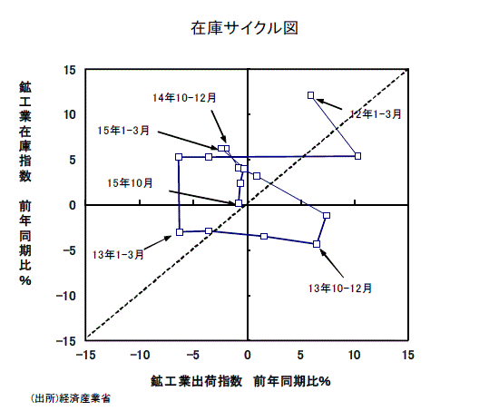 ●鉱工業全体での縦軸に在庫の前年比をとった在庫サイクル図をみると、14年1~3月期では、出荷の前年比が+7.4%、在庫が同▲1.2%、と45度線を下回っていた。しかし、14年4~6月期では、在庫が前年同期比増加に転じ、出荷の前年比が+0.9%、在庫が同+3.1%、と45度線を上回ってしまい、在庫積み上がり局面に入った。15年4~6月期でも、出荷の前年比が▲0.3%、在庫が同+4.0%、と45度線を上回っていた。前の四半期に当たる15年7~9月期では、出荷の前年比が▲0.6%、在庫が同+2.1%、と在庫の前年比は鈍化してきているものの、まだ45度線を上回っていた。15年10月では、出荷の前年比が▲0.8%、在庫が同+0.2%、と在庫の前年比が急低下したものの、まだ45度線を上回っている。
