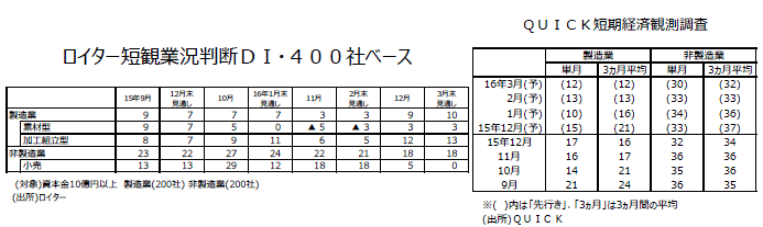 ●ロイター短観の3月までの「先行き見通し」は、製造業の400社ベースで+10と12月実績の+9より1ポイント改善、非製造業の400社ベースの3月までの「先行き見通し」は+18と、12月実績と同じという予想である。QUICK短観の製造業の3月までの「先行き見通し」は+12で12月実績の+17より5ポイント低下の予想、非製造業の「先行き見通し」は+30で12月実績の+32に比べて2ポイント低下する予想である。