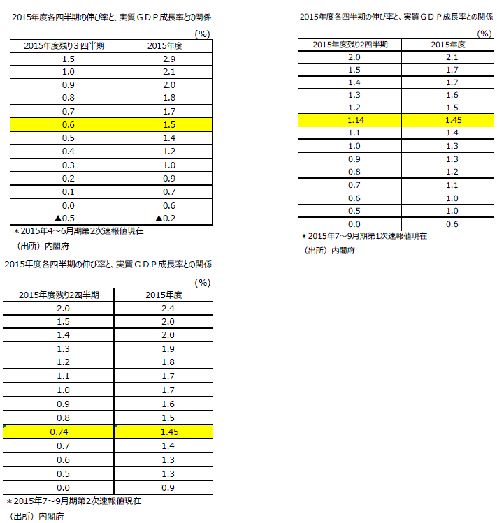 ●15年度実質GDP成長率に関して14年度から15年度のゲタは+0.8%になった。15年度の残りの2四半期の前期比が+0.74%・前期比年率+3.0%だと、内閣府年央試算の15年度実質経済成長率+1.5%程度を達成できるが、ハードルは高そうだ。15年度の残りの2四半期の前期比が0.0%だと15年度の実質GDP成長率は+0.9%成長になる。15年度の残りの2四半期の前期比が+0.5%だと15年度の実質GDP成長率は+1.3%成長になる。