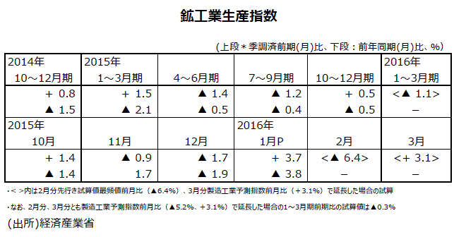 ●先⾏きの鉱⼯業⽣産指数を、2⽉分先⾏き試算値最頻値前⽉⽐(▲6.4%)、3⽉分製造⼯業予測指数前⽉⽐(+3.1%)で延⻑した場合1〜3⽉期の前期⽐は▲1.1%と2四半期ぶりの減少になる⾒込みだ。また、2⽉分、3⽉分とも製造⼯業予測指数前⽉⽐(▲5.2%、+3.1%)で延⻑した場合の1〜3⽉期前期⽐の試算値は▲0.3%とこちらも減少になってしまう。年明けの⾦融市場の混乱と併せ、主に特殊要因によるとはいえ、経済指標の弱含みが、⼈々の景況感を冷やさないか懸念される局⾯だ。