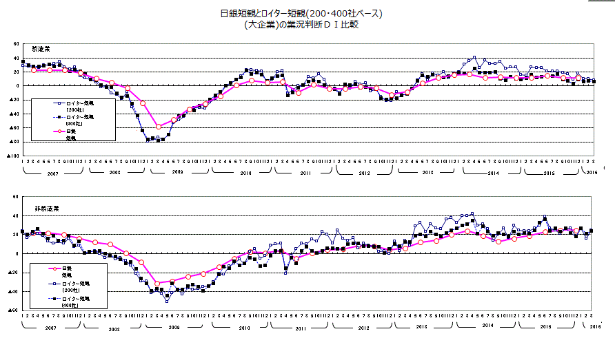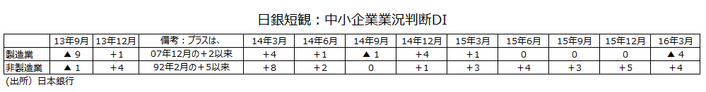 ●今回の短観は、全規模・全産業ベースの「最近」業況判断も12月調査に比べ2ポイント低下し、+7になり、「先行き」が+1に低下するなど、不安心理が高まり企業の景況感が6月頃に向け下振れていることを示唆する結果になった。但し、3月調査の「最近」業況判断は12月調査の「先行き」見通し+3にくらべ4ポイント上振れ、足元は事前の予想よりは底堅い内容だったとも言えよう。5月の伊勢志摩サミットを控え、G7の経済政策での協調などに対する期待が高まりやすい局面だろう。