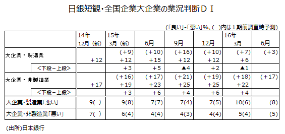 ●全規模・全産業の業況判断DIは、過去最悪の98年9月調査の▲48に近かった09年3月調査の▲46を底に上昇し、東日本大震災による一時的落ち込みなどを挟んで13年9月調査で+2と07年12月以来のプラスになった。消費税率引き上げ直前の14年3月調査では91年11月の+12以来の水準である+12まで改善していた。消費税率引き上げにより悪化し14年9月調査で+4になっていたが、その後横這いを含みつつ改善し15年9月調査で+8、12月調査で+9と2期連続改善したが今回+7と2ポイント低下した。今回の低下幅は大企業が相対的に大きかったことがわかる。全規模・全産業という全体の景況感は12期連続してプラスの水準だ。景気が底上げされてきたことを示唆する数字だろう。