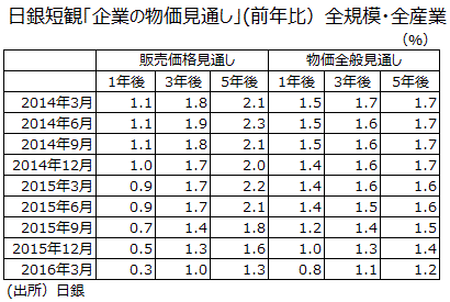 ●この調査が始まった2年前と比べると、全規模・全産業ベースの物価全般の見通し平均は、1年後が0.7ポイント低下した。3年後は0.6ポイント低下、5年後が0.5ポイント低下になった。日銀の超緩和的な金融緩和政策が実施されてきたにもかかわらず、原油価格の大幅低下などで、企業の予想インフレ率は低下傾向にあることを示唆する結果となった。マーケットでの一段の金融緩和への期待が高まる内容であろう。