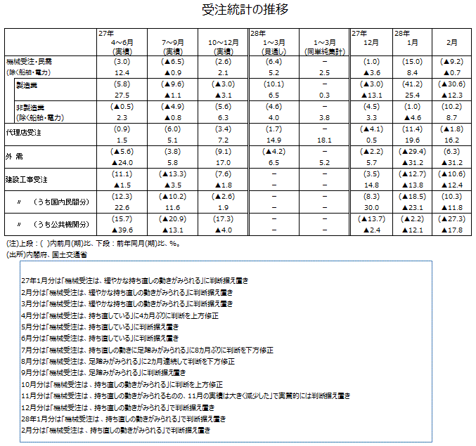 ●内閣府の基調判断は、15年7月分では「機械受注は、持ち直しの動きに足踏みがみられる」に8カ月ぶりに下方修正された。さらに8月分では「機械受注は、足踏みがみられる」へと連続して下方修正となった。8月には中国発世界同時株安など企業心理を冷え込ませる状況が生じたからだ。9月分では判断据え置きだったが、10月分では「機械受注は 、持ち直しの動きがみられる」に判断が上方修正された。11月分では「機械受注は、持ち直しの動きがみられるものの、11月の実績は大きく減少した」となったが、これは機械受注(除船電民需)前月比が▲14.4%と2ケタの大幅な減少率なので、言及せざるをえなかったのだろう。12月分・1月分では「機械受注は、持ち直しの動きがみられる」で判断据え置きとなった。今回2月分でも「機械受注は、持ち直しの動きがみられる」で実質的に5カ月連続の判断据え置きになった。