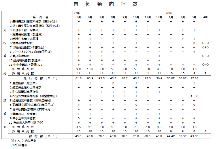 ●また、4月分の先行DIでは、数値が判明している4系列のうち、日経商品指数1系列がプラス符号に、消費者態度指数、東証株価指数、中小企業売上げ見通しDIの3系列がマイナス符号になることが判明している。このため4月分先行DI速報値は、11.1%以上66.7%以下が確定している。