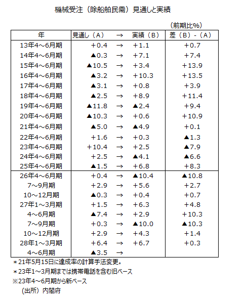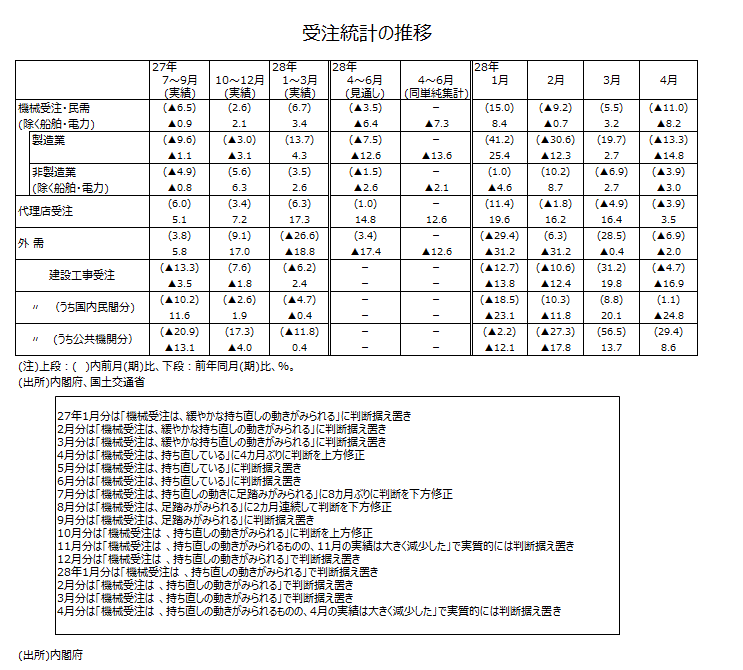 ●内閣府の基調判断は、15年7月分では「機械受注は、持ち直しの動きに足踏みがみられる」に8カ月ぶりに下方修正された。さらに8月分では「機械受注は、足踏みがみられる」へと連続して下方修正となった。8月には中国発世界同時株安など企業心理を冷え込ませる状況が生じたからだ。9月分では判断据え置きだったが、10月分では「機械受注は、持ち直しの動きがみられる」に判断が上方修正された。11月分では「機械受注は、持ち直しの動きがみられるものの、11月の実績は大きく減少した」となったが、これは機械受注(除船電民需)前月比が▲14.4%(当初)と2ケタの大幅な減少率なので、言及せざるをえなかったのだろう。12月分・1月分・2月分・3月分では「機械受注は、持ち直しの動きがみられる」で判断据え置きとなった。今回4月分では「機械受注は、持ち直しの動きがみられるものの、4月の実績は大きく減少した」と11月分と同じ表現になったものの、持ち直しに重点が置かれていて、実質的に7カ月連続の判断据え置きになった。