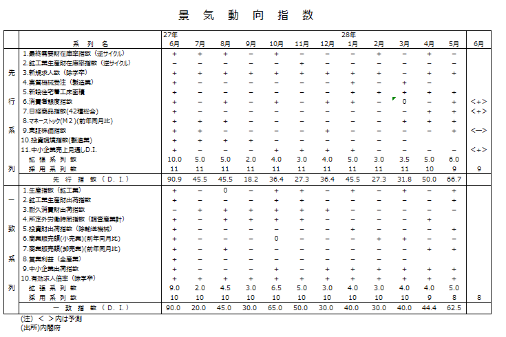 ●また、6月分の先行DIでは、数値が判明している4系列のうち、消費者態度指数、日経商品指数、中小企業売上げ見通しDIの3系列がプラス符号に、東証株価指数1系列がマイナス符号になることが判明している。このため、6月分先行DI速報値は、33.3%以上88.9%以下が確定している。