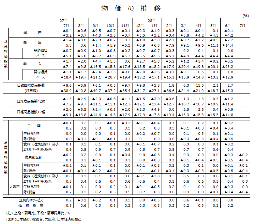 ●7月分の生鮮食品を除く総合の前年同月比は、東京都区部(速報)は▲0.4%で6月分の同▲0.5%から下落率が縮小したものの、7カ月連続の下落だ。7月分の前月比は▲0.1%だった。大阪市の生鮮食品を除く総合の7月分前年同月比は▲0.4%と6月分と同じ下落率だった。7月分の前月比は0.0%だった。