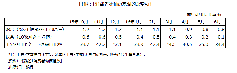 ●6月分の生鮮食品を除く総合指数は2010年を100とした指数は103.0で、前月比は▲0.1%下落、前年同月比は▲0.5%下落した。13年3月の▲0.5%以来、3年3カ月ぶりの下落幅である。前年同月比の下落は4カ月連続だ。
