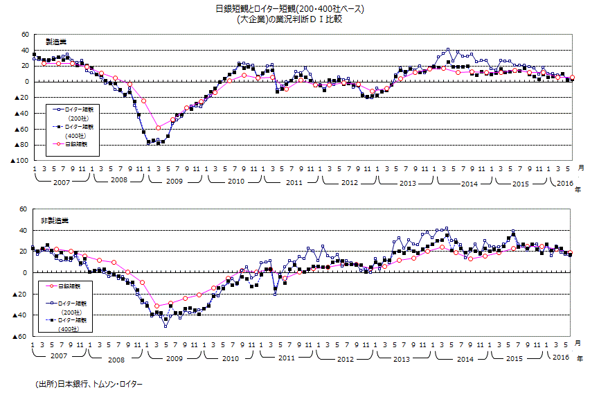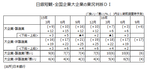 ●6月調査の大企業・非製造業・業況判断DI+19は、12月調査の「先行き」+17を2ポイント上回る数字で、景況感が思ったより良かったことを示唆している。大企業・非製造業で「悪い」と答えた割合は15年6月調査・9月調査・12月調査で同じ4%であったが、16年3月調査では1ポイント上昇し5%に、今回の6月調査でも1ポイント上昇し6%と、じりじりと悪化している。