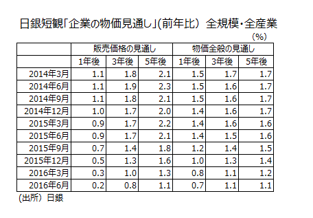 2016年6月調査 日銀短観・企業の物価見通し