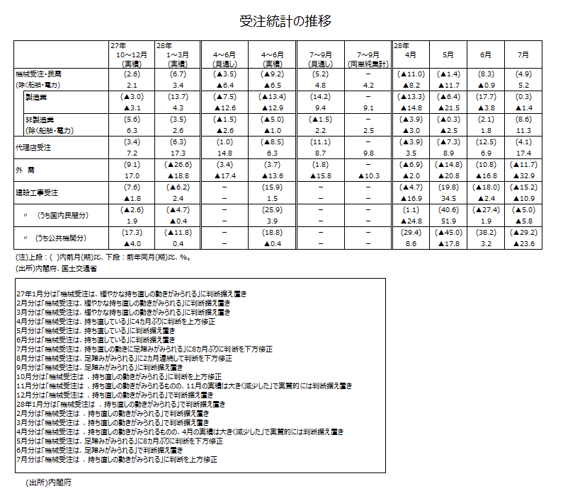 ●内閣府の基調判断は、15年12月分・16年1月分・2月分・3月分では「機械受注は、持ち直しの動きがみられる」で判断据え置きとなった。16年4月分では「機械受注は、持ち直しの動きがみられるものの、4月の実績は大きく減少した」と11月分と同じ表現になったものの、持ち直しに重点が置かれていて、実質的に7カ月連続の判断据え置きになった。5月分では「機械受注は、足踏みがみられる」へと8カ月ぶりに下方修正となった。前回6月分も「機械受注は、足踏みがみられる」で判断据え置きになった。今回7月分では内容がしっかりしていることを受けて「機械受注は、持ち直しの動きがみられる」になった。3カ月ぶりに「持ち直し」の表現が使われた。基調判断の上方修正は15年10月分以来9カ月ぶりである。