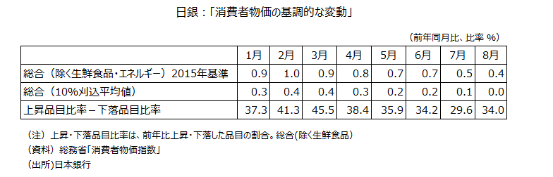 ―日銀流コア8月分前年同月比は+0.4%へ、内閣府流コア前年同月比は+0.3%に鈍化―