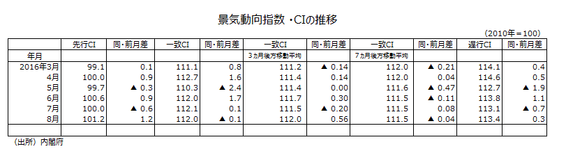 -8月分までの数字不変、9月分・10月分各々前月差+0.1ずつ上昇で「改善」に-