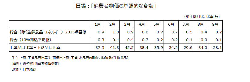 ―日銀流コア9月分前年同月比は+0.2%へ、内閣府流コア前年同月比は+0.1%に鈍化―