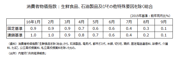 ●また、内閣府流のコア指数は、消費者物価指数・生鮮食品を除く総合から、石油製品、電気代、都市ガス代、米類、切り花、鶏卵、固定電話通信料、診療代、介護料、たばこ、公立高校授業料、私立高校授業料を除いたものだ。2015年基準の、内閣府流コア指数(固定基準)1~3月分の前年同月比は、+0.9%だったが、4月分以降伸び率が鈍化し、今回9月分は+0.1%まで鈍化した。2010年基準時代の13年9月分の0.0%以来の低い伸び率である。また、内閣府が月例経済報告の判断で重視しているとみられる季節調整済み前月比では、8月分・9月分と内閣府流のコア指数前月比は2カ月連続横這いとなった。