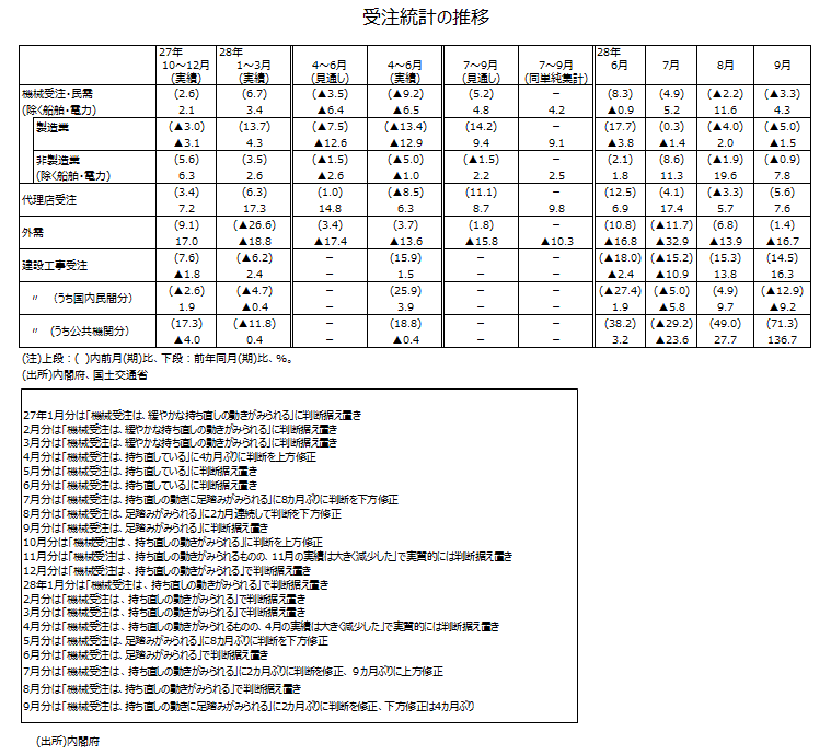 ●内閣府の基調判断は、16年5月分で「機械受注は、足踏みがみられる」へと8カ月ぶりに下方修正となった。6月分も「機械受注は、足踏みがみられる」で判断据え置きになった。しかし、7月分では内容がしっかりしていることを受けて「機械受注は、持ち直しの動きがみられる」になった。3カ月ぶりに「持ち直し」の表現が使われた。基調判断の上方修正は15年10月分以来9カ月ぶりであった。8月分でも基調判断は据え置かれ「機械受注は、持ち直しの動きがみられる」に据え置かれていたが、今回9月分では2カ月連続減少になったことなどから、「機械受注は、持ち直しの動きに足踏みがみられる」に2カ月ぶりに判断修正、4カ月ぶりの下方修正となった。