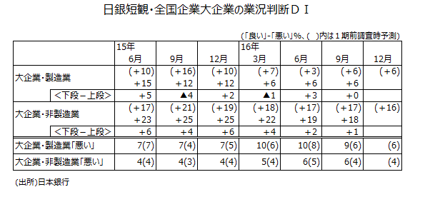 ●9月調査の大企業・製造業の業況判断DI+6は6月調査の「先行き」見通し+6と同じ数字になった。足元の景況感が予測したものと同じだったということになる。