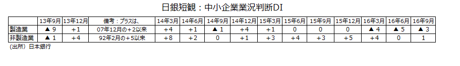 ●1ドル=100円台前半の円高基調が継続している。9月調査で16年度の企業の想定為替レートが107円92銭であることから、企業収益・輸出・生産にマイナスの影響が出ていると考えられる。DIは足踏み状態で2ケタのプラスにはならないが、14期連続で「良い」超を意味するプラスを維持できたことで底堅さも確認できたと言えよう。