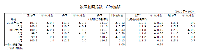 -3月分の一致CI3カ月後方移動平均の前月差マイナス転換で5月分も「足踏み」に-