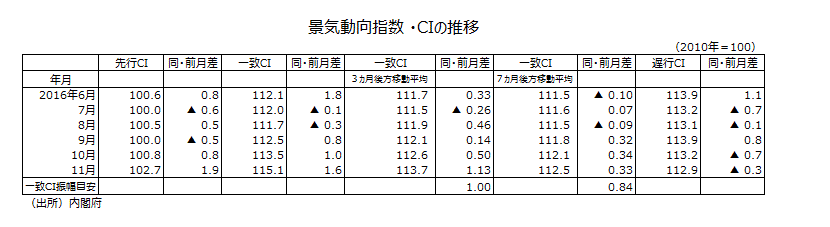 ●その後、15年6月分~16年9月分でも判断据え置きで、1年5カ月間もの間、同じ基調判断が続いていたが16年10月分で「改善を示している」に上方修正された。今回11月分は2カ月連続で「改善を示している」になった。