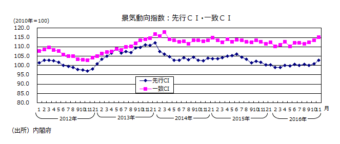 -一致CI前月差+1.6で3カ月連続上昇。2年3カ月ぶりの高水準に-