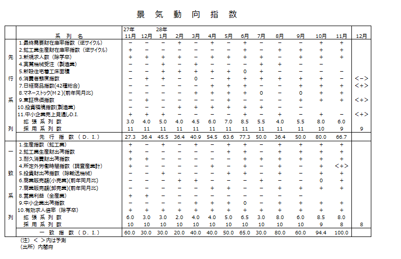-一致DIは4カ月連続で景気判断分岐点50%超。11月分全てプラスの100.0%-