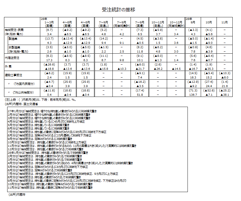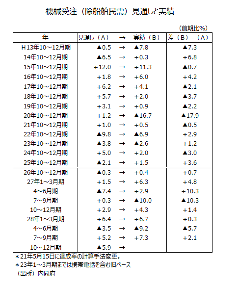 ●内閣府の基調判断は、16年5月分で「機械受注は、足踏みがみられる」へと8カ月ぶりに下方修正となった。6月分も「機械受注は、足踏みがみられる」で判断据え置きになった。しかし、7月分では内容がしっかりしていることを受けて「機械受注は、持ち直しの動きがみられる」になった。3カ月ぶりに「持ち直し」の表現が使われた。基調判断の上方修正は15年10月分以来9カ月ぶりであった。8月分でも基調判断は据え置かれ「機械受注は、持ち直しの動きがみられる」に据え置かれていたが、9月分では2カ月連続減少になったことなどから、「機械受注は、持ち直しの動きに足踏みがみられる」に2カ月ぶりに判断修正、4カ月ぶりの下方修正となった。