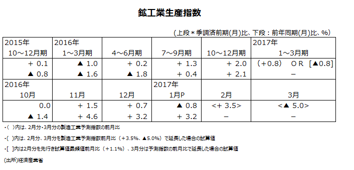 ●経済産業省の基調判断は16年8月分では「総じてみれば、生産は緩やかな持ち直しの動きがみられる」という判断に2カ月ぶりに上方修正された。15年5月分から1回を除き続いてきた「一進一退」の表現がなくなった。16年9月分、10月分でも「総じてみれば、生産は緩やかな持ち直しの動きがみられる」という判断は維持された。16年11月分では「緩やかな」がとれて「総じてみれば、生産は持ち直しの動きがみられる」という判断に上方修正された。前回16年12月分に続き今回17年1月分でも「総じてみれば、生産は持ち直しの動きがみられる」という判断は継続となった。