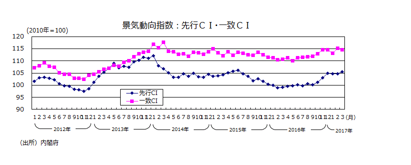 ●一致CIを使った景気の基調判断をみると、15年5月分~16年9月分の1年5カ月間もの間、景気拡張の動きが足踏み状態になっている可能性が高いことを示す「足踏みを示している」という同じ基調判断が続いていたが、16年10月分で「改善を示している」に上方修正された。その後11月分・12月分・17年1月分・2月分と同じ基調判断だった。今回3月分も「改善を示している」で6カ月連続して最高の判断が続いている。