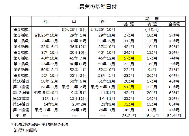 ●今年の11月上旬に発表される9月分まで「改善」が続くと、65年11月から始まった「いざなぎ景気」の57カ月を抜き、景気拡張の長さは戦後単独第2位の58カ月となる。