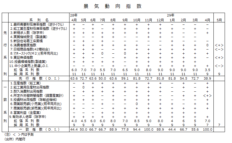 ●また、5月分の先行DIでは、数値が判明している消費者態度指数、日経商品指数、東証株価指数、中小企業売上げ見通しDIの4系列でプラス符号は消費者態度指数、東証株価指数の2系列、マイナス符号は日経商品指数、中小企業売上げ見通しDIの2系列と判明している。5月分速報値段階の先行DIは22.2%以上77.8%以下が確定している。